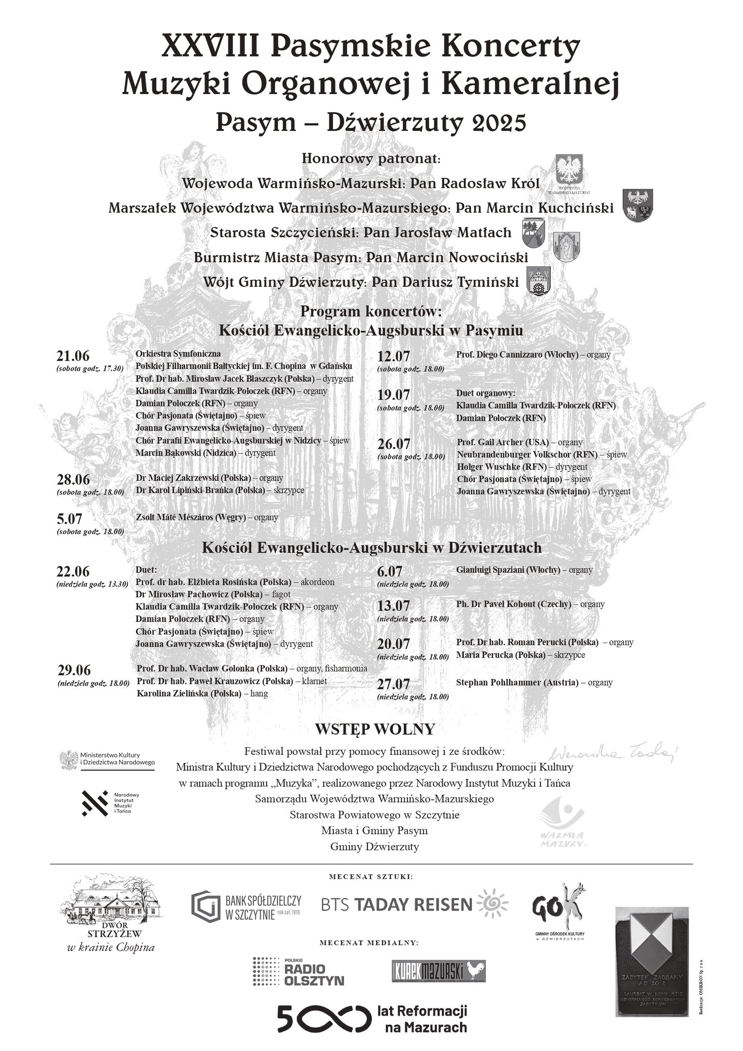 Letnie weekendowe wieczory znów rozbrzmiewać będą magią dźwięków w niezwykłej atmosferze zabytkowych świątyń! Dla miłośników muzyki organowej mamy doskonałe wieści – od 21 czerwca do 27 lipca 2025 zapraszamy na wyjątkowy cykl koncertów w kościołach ewangelicko-augsburskich w Pasymiu i Dźwierzutach