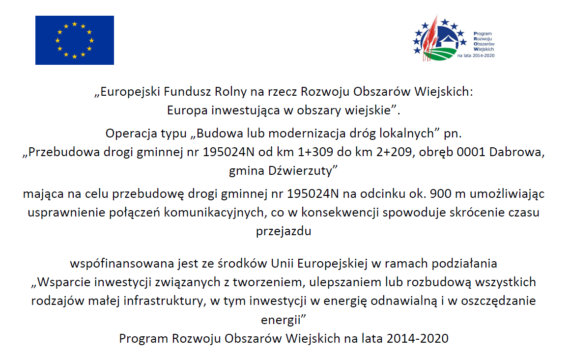 W dniu 10.06.2019 r. Wójt Gminy Dźwierzuty Pani Marianna Bogusława Szydlik wraz z Panią Agatą Urbańską Skarbnikiem Gminy podpisały w Urzędzie Marszałkowskim Województwa Warmińsko-Mazurskiego umowę o przyznaniu pomocy dla zadania pn. „Przebudowa drogi gminnej nr 195024N od km 1+309 do km 2+209, obręb 0001 Dabrowa, gmina Dźwierzuty”.